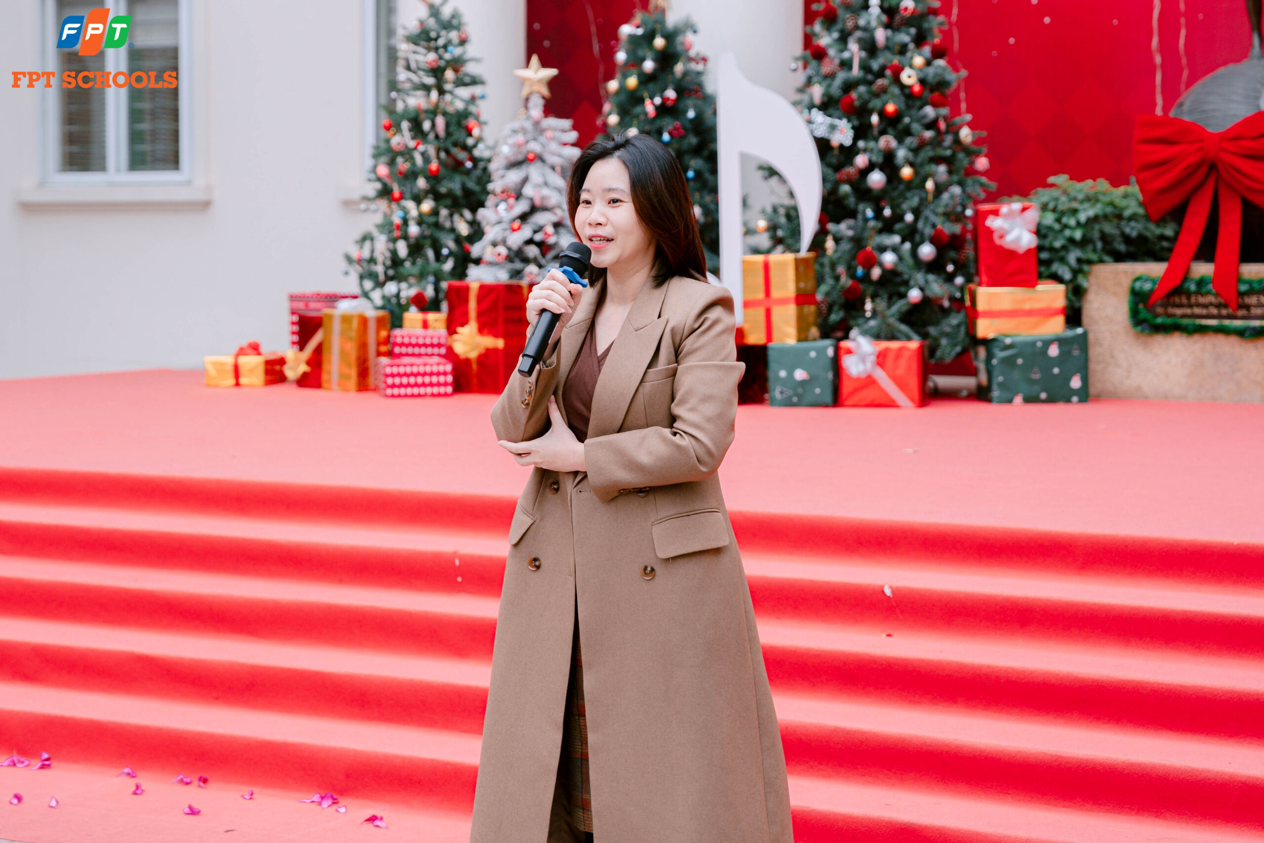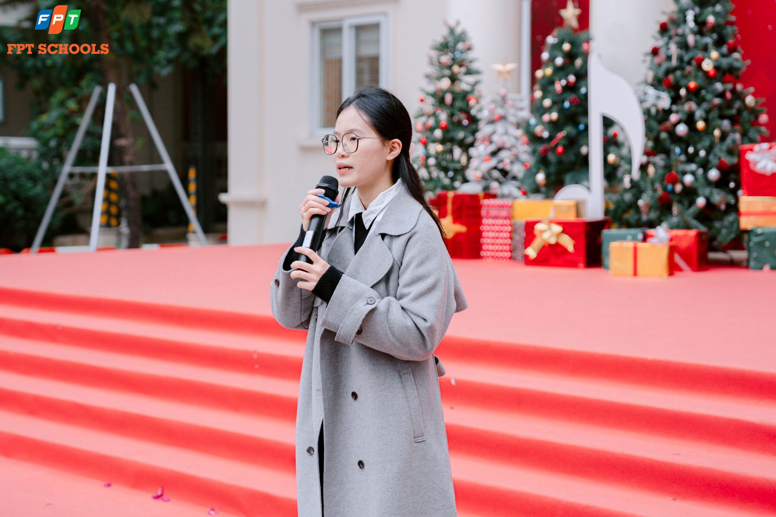 Tâm điểm của buổi lễ chính là những lời chia sẻ đầy xúc động và tâm huyết từ cô Nguyễn Thị Thu Hiền, người luôn đồng hành và thấu hiểu từng bước chuyển mình của các học trò. Trong buổi sinh hoạt dưới cờ đầu năm 2026 này, cô không đưa ra những con số áp lực về thành tích hay những quy tắc khắt khe, mà thay vào đó là một cuộc trò chuyện chân thành về giá trị của sự thay đổi. Cô nhắn nhủ rằng mỗi năm mới chính là một tấm gương phản chiếu để các em tự soi lại chính mình, để thấy rằng sự trưởng thành thực sự không nằm ở những trang sách dày thêm mà nằm ở việc các em đã dũng cảm thế nào khi đối mặt với những thói quen cũ chưa tốt. Cô khuyến khích học sinh hãy coi năm 2026 như một sân chơi của sự trải nghiệm, nơi mỗi người được quyền sai để sửa, được quyền thử thách bản thân để tìm thấy niềm đam mê đích thực. Những lời dặn dò ấy đã khơi dậy một luồng sinh khí mới, giúp học sinh nhận ra rằng hành trình học tập tại FSchool không chỉ là việc tích lũy kiến thức mà còn là quá trình tôi luyện bản lĩnh và lòng trắc ẩn để trở thành những công dân có ích cho xã hội.
