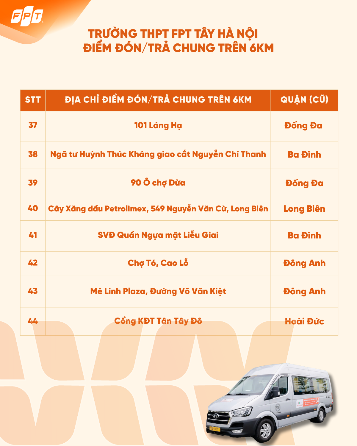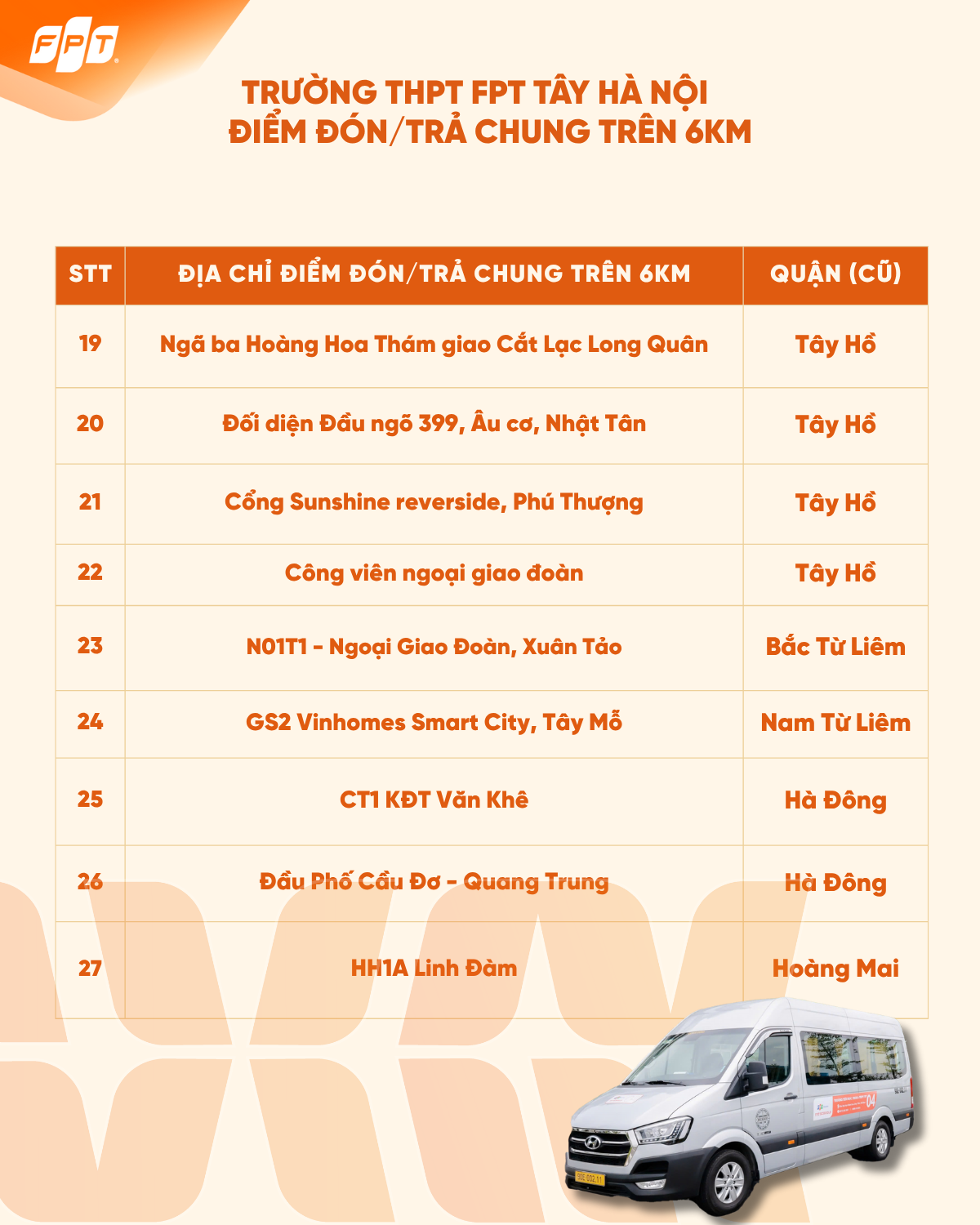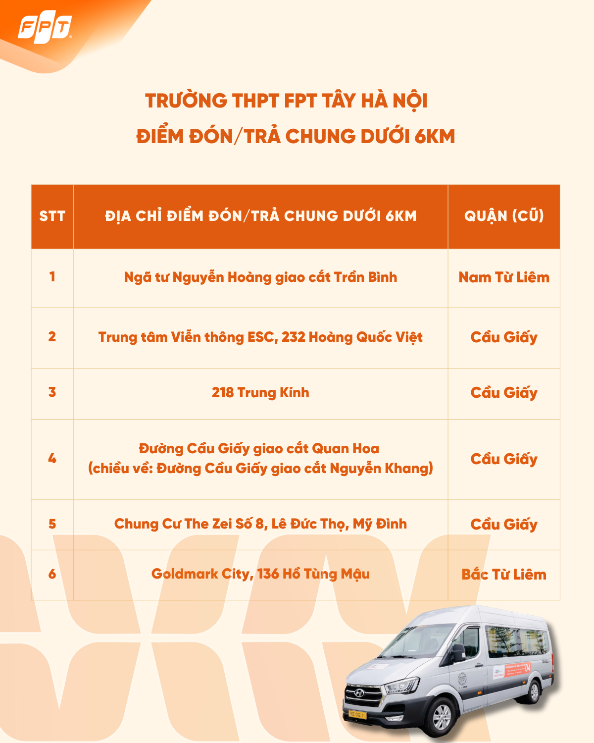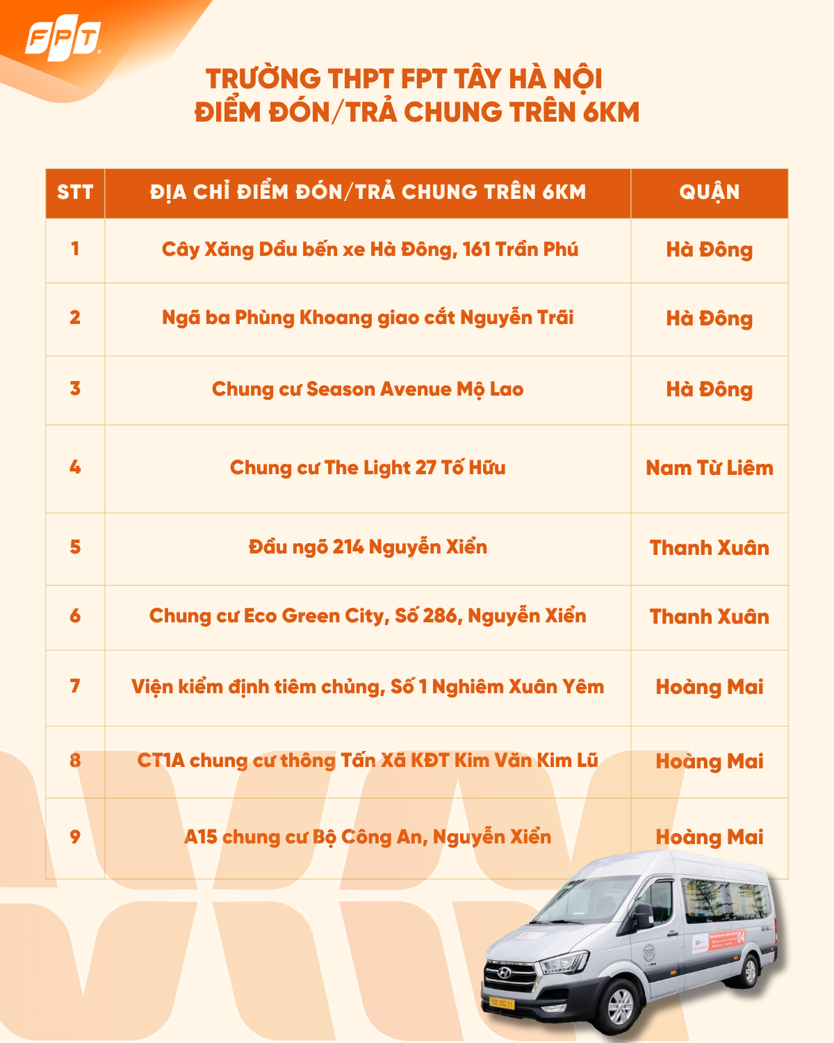 Đầu năm học, Nhà trường lựa chọn đơn vị cung cấp dịch vụ vận tải có kinh nghiệm và uy tín để tổ chức hoạt động đón trả học sinh có nhu cầu sử dụng dịch vụ. Xe tuyến được đưa vào sử dụng là xe ô tô đời mới (không quá 05 năm) loại 16 hoặc 29 chỗ (tùy theo số lượng và nhu cầu học sinh) được trang bị đầy đủ điều hòa không khí, trang thiết bị y tế, camera hành trình theo quy chuẩn, có dán logo Trường THPT FPT Tây Hà Nội và thường xuyên được vệ sinh sạch sẽ.