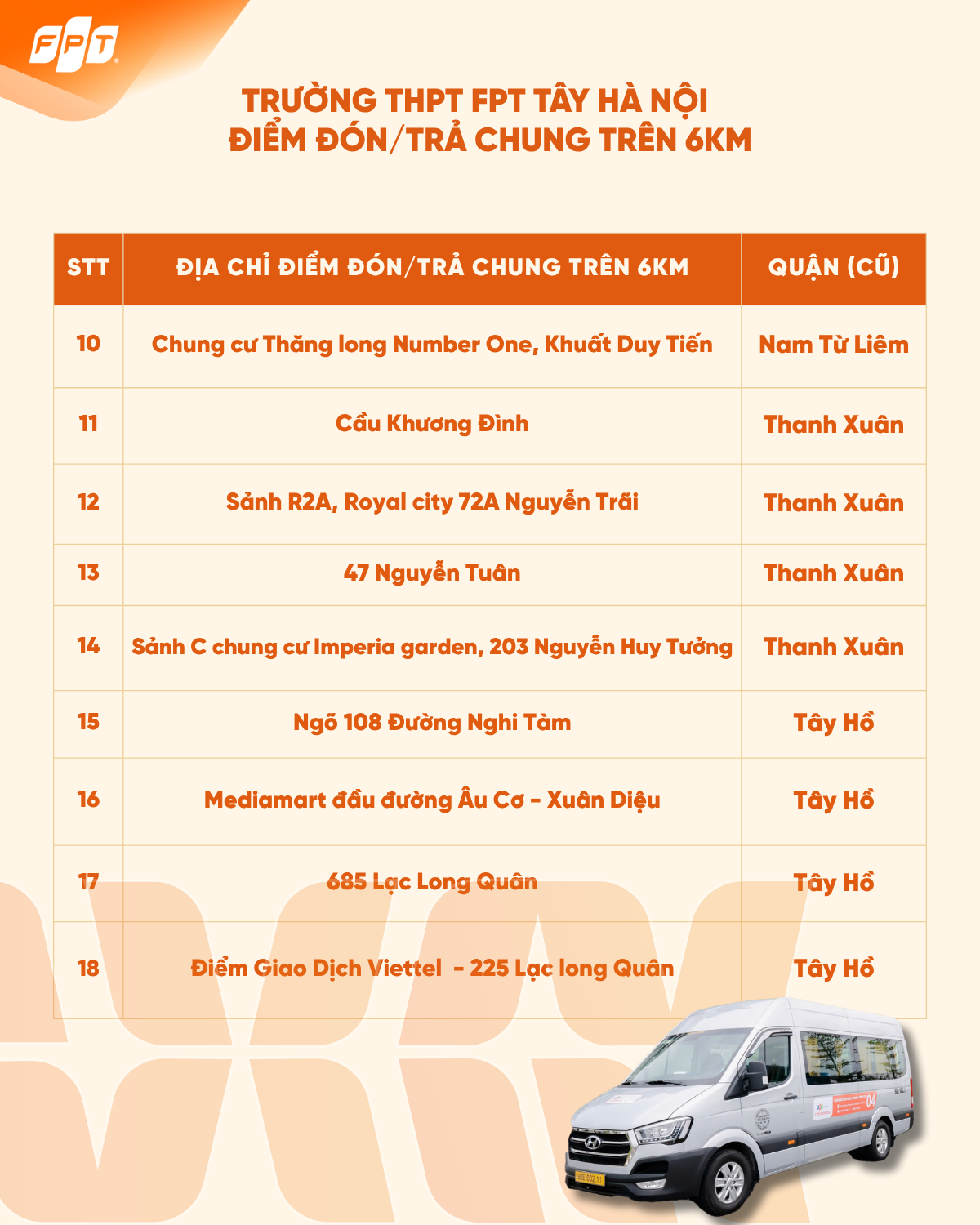 Với các điểm đón riêng, nhà trường sẽ căn cứ trên đăng ký của Quý Phụ huynh để sắp xếp hợp lý. Dưới đây là lộ trình đón/trả tại điểm chung năm học 2025 - 2026 (Danh sách này đã được đưa lên hệ thống đăng ký. PHHS cần ghi rõ địa điểm mong muốn đưa đón, phần mềm sẽ gợi ý những điểm đón trả chung gần nhất).