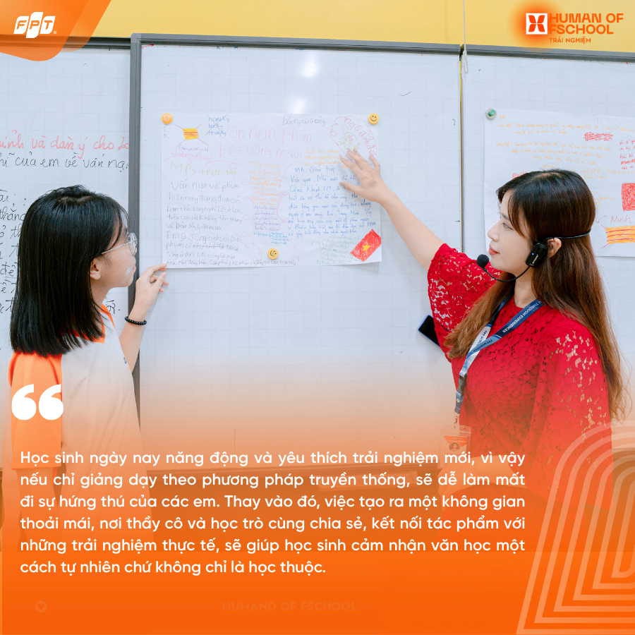 Cô giáo dạy Văn nhà Fschool Tây Hà Nội cũng đặc biệt chú trọng vào việc phát triển năng lực sáng tạo và tư duy phản biện của học sinh: “Các em cần dám đặt câu hỏi, nhìn nhận vấn đề theo cách riêng của mình, thể hiện quan điểm một cách tự tin. Kỹ năng thuyết trình và phản biện cũng vô cùng quan trọng trong thế giới ngày nay, không chỉ giúp các em viết hay mà còn giúp các em nói và kể chuyện hấp dẫn”.