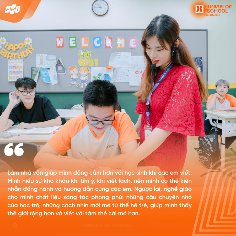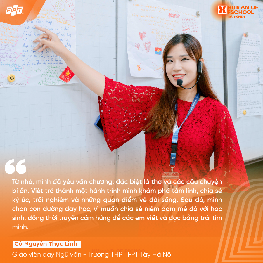 Những thành công trong sự nghiệp văn chương đã thôi thúc cô Thục Linh lựa chọn con đường giảng dạy để tiếp tục truyền cảm hứng cho nhiều thế hệ học sinh. Với cô, FSchool Tây Hà Nội chính là nơi lý tưởng để vừa thực hiện sứ mệnh của một người thầy, vừa duy trì ngọn lửa sáng tạo trong bản thân mình.