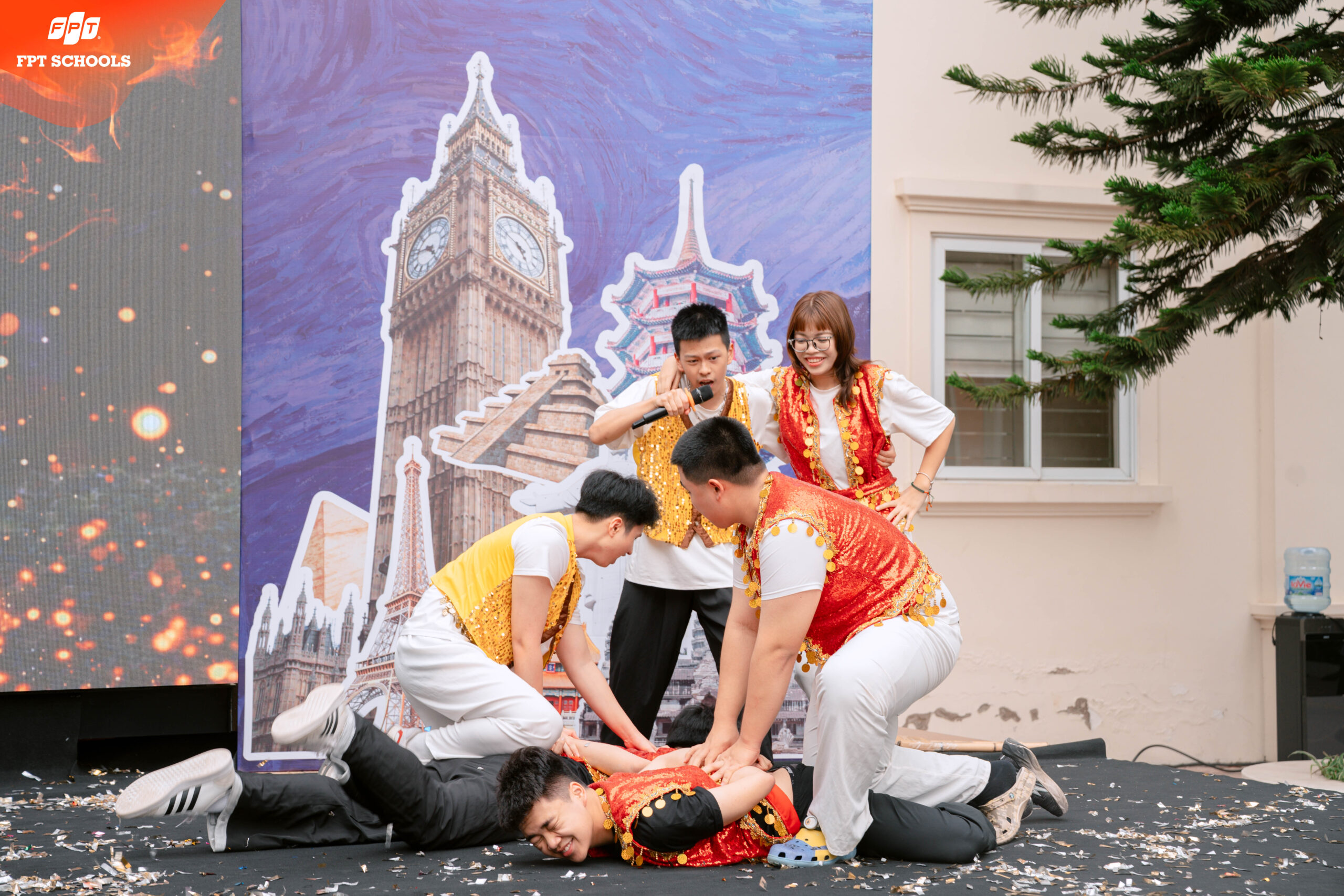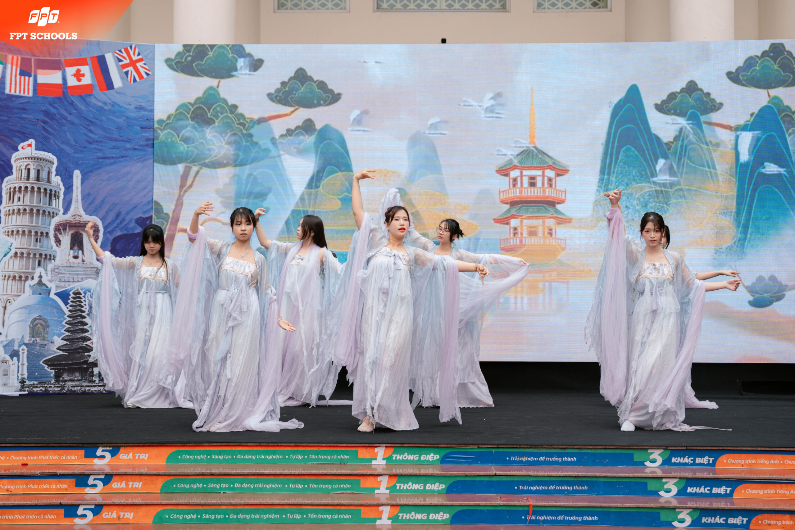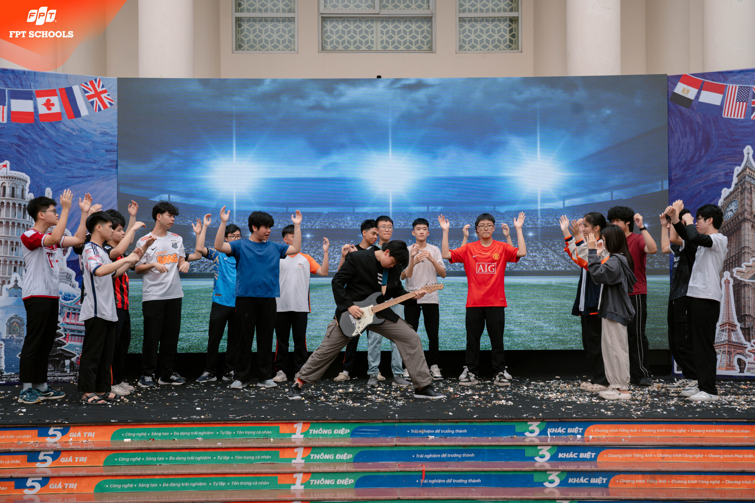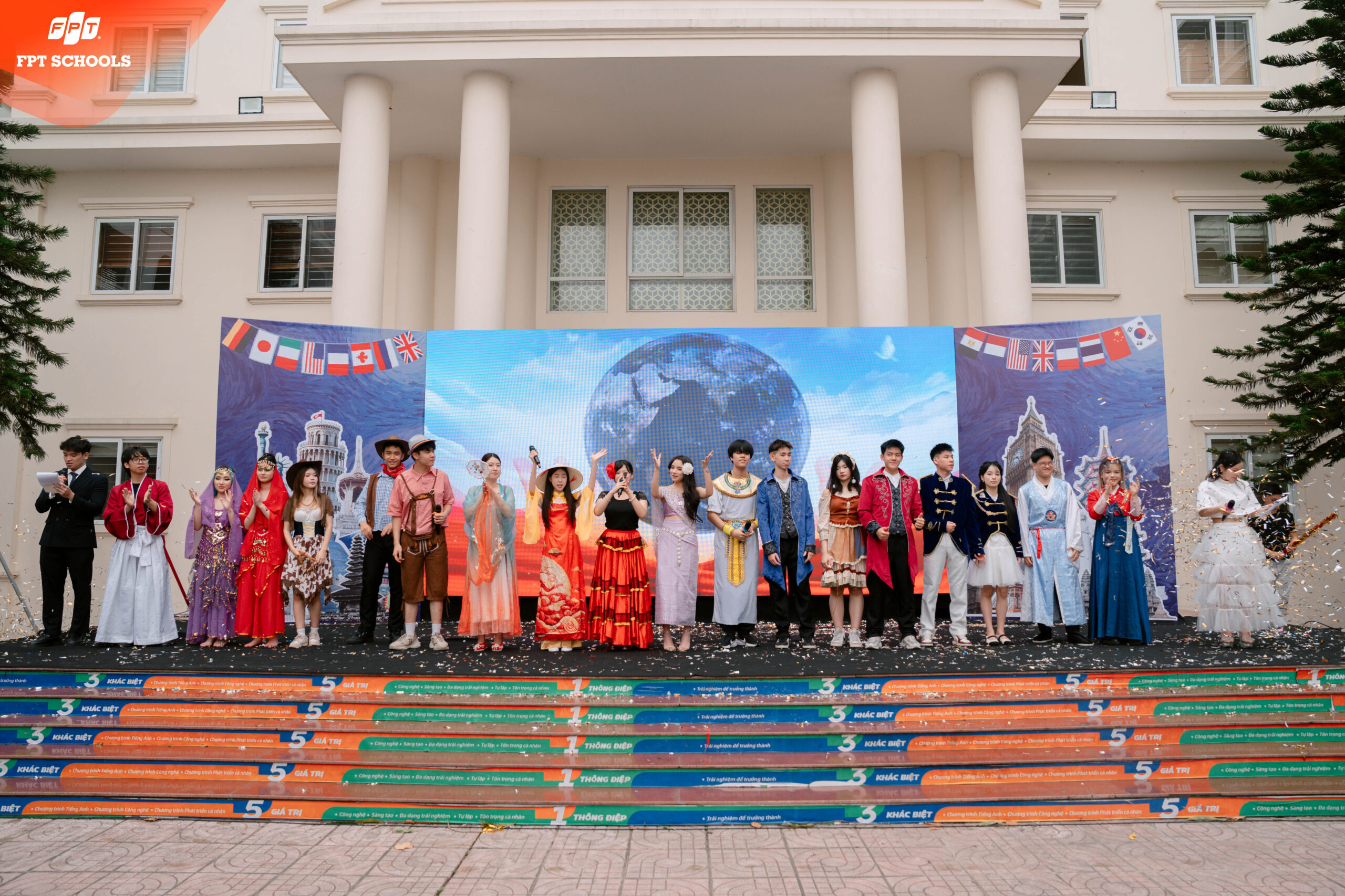 Cái tên “Festopia” – sự kết hợp giữa Festival (Lễ hội) và Utopia (Vùng đất lý tưởng) – đã nói lên tất cả tham vọng của nhà trường trong việc xây dựng một môi trường học tập lý tưởng. Tại International Day 2026, chúng tôi không chỉ giới thiệu về các quốc gia như những thực thể địa lý, mà chúng tôi kiến tạo nên một không gian nơi mỗi học sinh được sống, được thở và được tương tác với tinh hoa của nhân loại. Trong bối cảnh thế giới đang đối mặt với nhiều biến động, việc tạo ra một “bản hòa ca” giữa các nền văn minh tại FPT School Tây Hà Nội là lời khẳng định về sự đoàn kết, lòng bao dung và tư duy cởi mở. Ban tổ chức đã dành nhiều tháng để lên ý tưởng, đảm bảo rằng mỗi gian hàng, mỗi tiết mục biểu diễn đều mang một hàm lượng tri thức nhất định. International Day 2026 không chỉ có sắc màu rực rỡ mà còn có chiều sâu của sự nghiên cứu. Các em học sinh không chỉ mặc trang phục truyền thống của các nước, mà các em còn phải tìm hiểu về ý nghĩa của từng hoa văn, về lịch sử của từng điệu nhảy và cả những giá trị cốt lõi làm nên linh hồn của quốc gia đó. Đây chính là cách FPT School nuôi dưỡng những “Công dân toàn cầu” có gốc rễ văn hóa vững chắc nhưng lại có đôi cánh tư duy sẵn sàng bay xa. Nếu có một ngôn ngữ chung duy nhất có thể kết nối hàng triệu trái tim trên thế giới, đó chính là âm nhạc. Điểm nhấn rực rỡ và được mong chờ nhất của sự kiện International Day 2026 chính là cuộc thi biểu diễn nghệ thuật mang tên “Giai điệu năm châu”. Sân khấu chính của FESTOPIA đã chứng kiến những khoảnh khắc thăng hoa chưa từng có, nơi các FSchoolers không còn là những học sinh ngồi trên ghế nhà trường, mà đã thực sự hóa thân thành những nghệ sĩ, những sứ giả văn hóa thực thụ.
