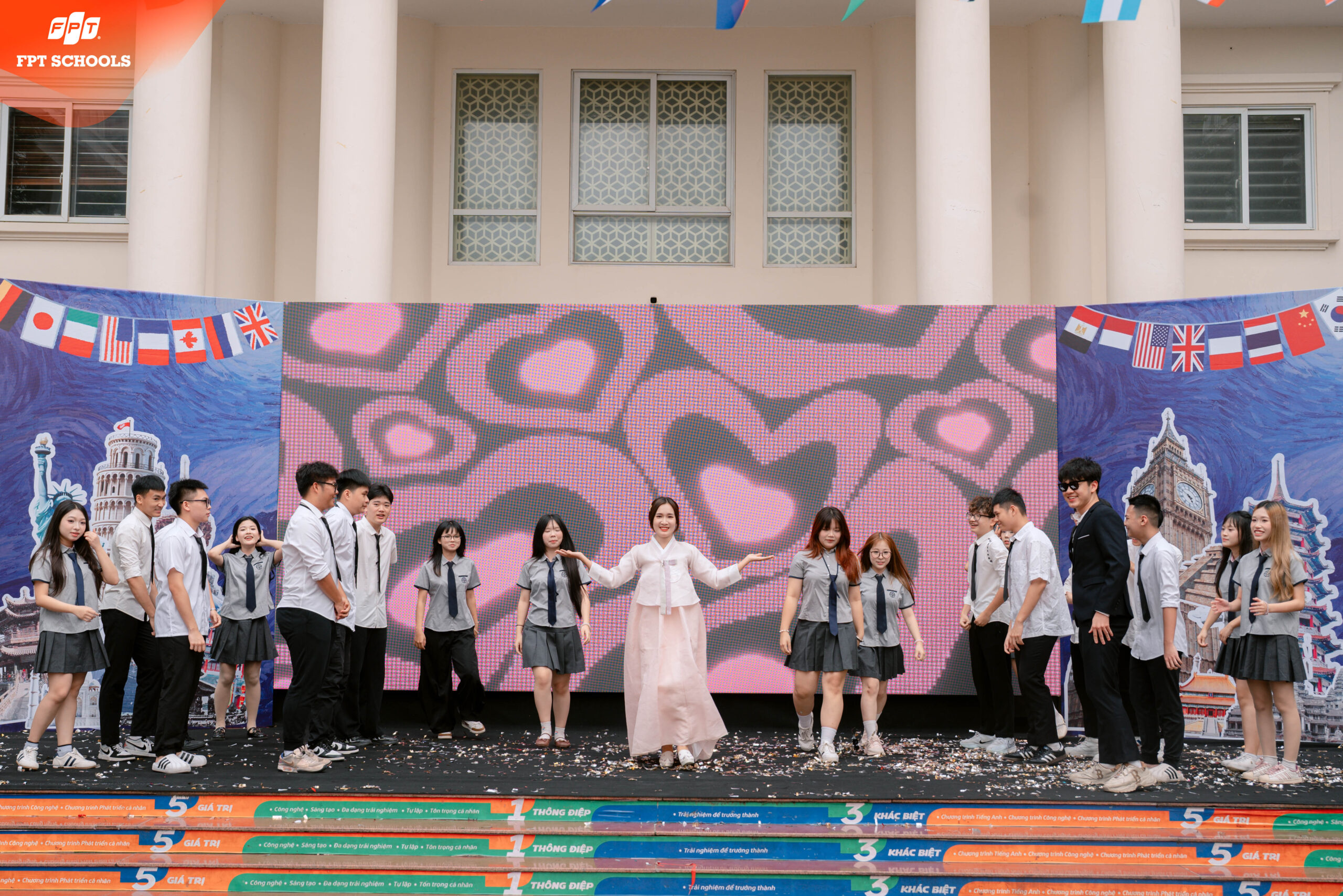 Hành trình giáo dục tại FPT School Tây Hà Nội chưa bao giờ chỉ dừng lại ở những con số hay những định lý trên trang giấy. Chúng tôi tin rằng, để một đứa trẻ trưởng thành và vững vàng trong thế kỷ 21, các em cần một đôi mắt nhìn ra thế giới và một trái tim thấu cảm những giá trị nhân văn toàn cầu. Sáng ngày 31/03/2026, sân trường FPT School Tây Hà Nội đã thực sự bùng nổ với sự kiện International Day 2026 – FESTOPIA. Đây không chỉ đơn thuần là một hoạt động ngoại khóa, mà là một chiến lược giáo dục thực nghiệm quy mô lớn, nơi văn hóa, nghệ thuật và tri thức hòa quyện để tạo nên một trải nghiệm “xuyên không gian” đầy cảm hứng cho hàng ngàn học sinh, phụ huynh và giáo viên.