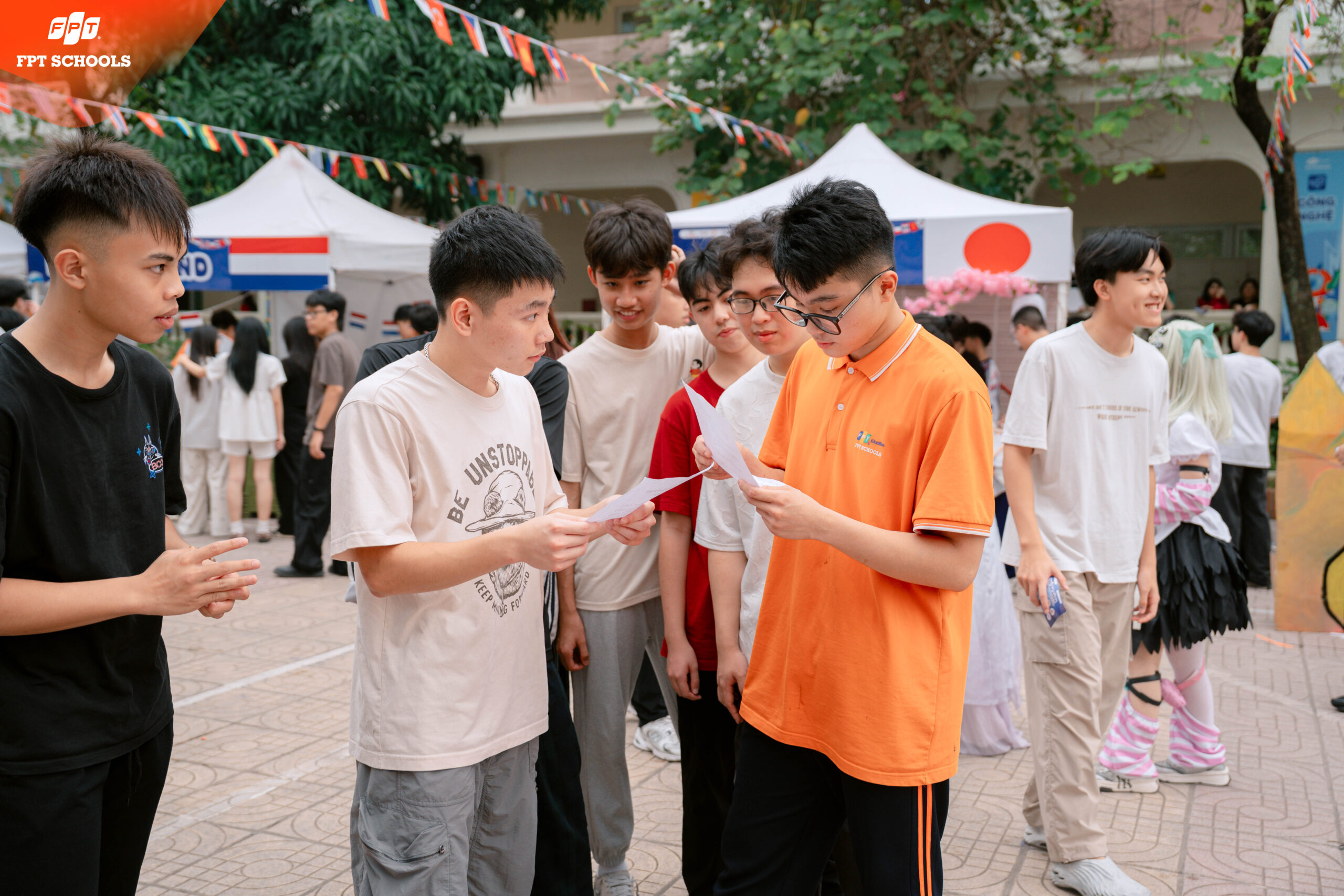 Một điểm độc đáo khiến International Day 2026 trở nên khác biệt hoàn toàn so với những ngày hội văn hóa thông thường chính là hệ thống giáo dục thực nghiệm qua gian hàng. Mỗi học sinh khi tham gia sự kiện đều được trao tay một chiếc “Thẻ du hành” – tấm hộ chiếu quyền năng dẫn lối các em bước vào mê cung của những điều kỳ thú. Tại mỗi trạm dừng chân, các em không chỉ đứng quan sát một cách thụ động mà phải trực tiếp tham gia vào các thử thách tương tác để được đóng dấu xác nhận hoàn thành hành trình. Các thử thách được thiết kế tinh tế để kích thích mọi giác quan và tư duy của học sinh. Có những trạm yêu cầu các em phải giải những câu đố hóc búa về lịch sử châu Âu, có những trạm lại đòi hỏi sự khéo léo khi thực hành nghệ thuật gấp giấy Origami hay nghệ thuật trà đạo. Thậm chí, khía cạnh ẩm thực cũng được đưa vào như một bài học về sự đa dạng, nơi các em được nếm thử hương vị của thế giới và tìm hiểu về sự thích nghi của con người với môi trường sống thông qua thói quen ăn uống. Những trải nghiệm thực tế này tại International Day 2026 giúp hình thành nhãn quan đa chiều, rèn luyện kỹ năng quan sát và bồi đắp tư duy phản biện. Đây chính là những viên gạch đầu tiên xây dựng nên năng lực hội nhập toàn cầu cho các em học sinh FPT School Tây Hà Nội.