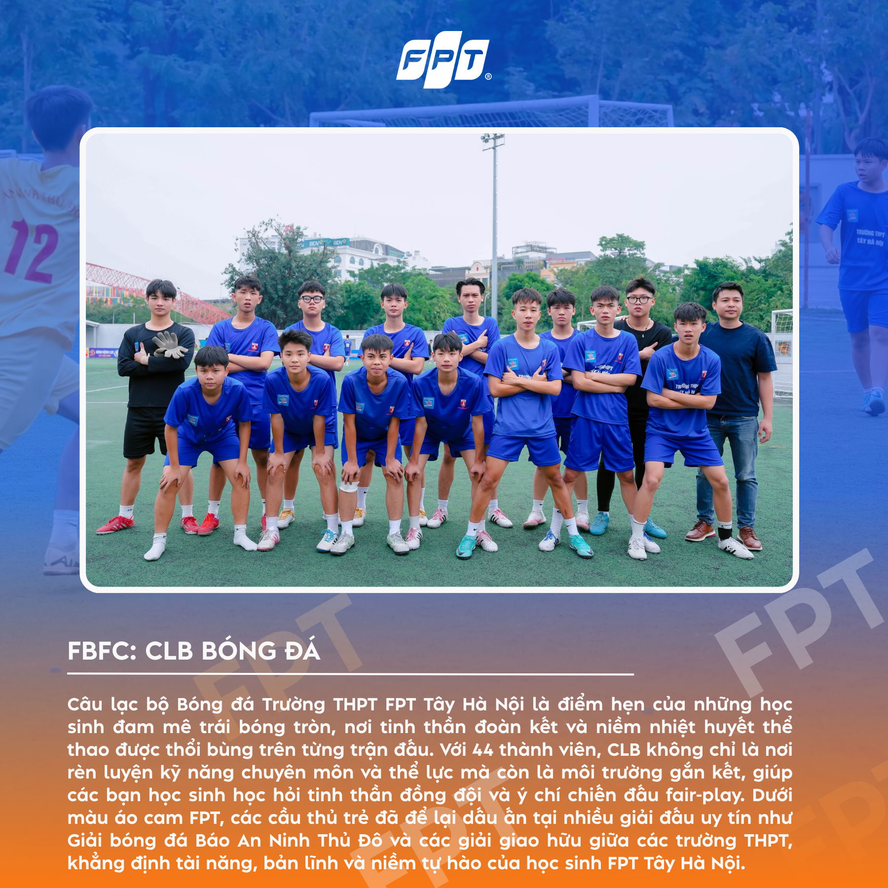 Hiện nay, Trường THPT FPT Tây Hà Nội có 14 CLB hoạt động đa lĩnh vực, bao gồm học thuật, nghệ thuật, thể thao và các hoạt động cộng đồng. Mỗi CLB mang trong mình một dấu ấn riêng, nhưng tất cả cùng chia sẻ một tinh thần chung: “Ghi lại những khoảnh khắc ý nghĩa của tuổi học trò dưới mái trường F.”