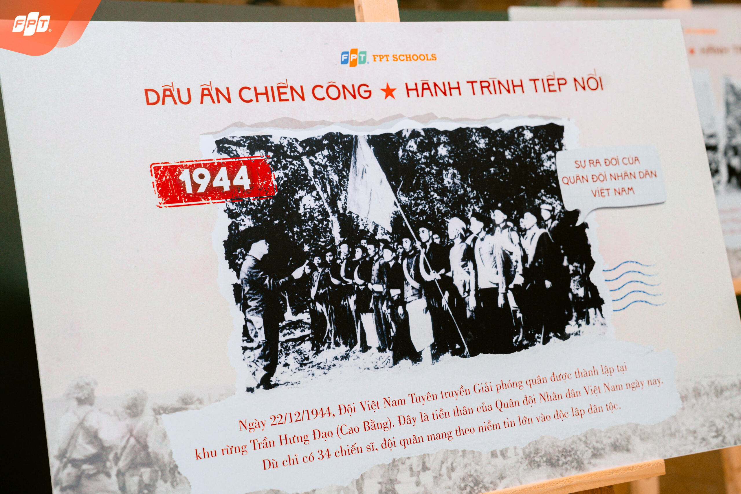Hành trình tiếp nối lịch sử tại triển lãm bắt đầu từ khoảnh khắc khai sinh ra lực lượng vũ trang cách mạng. Bước vào không gian đầu tiên, học sinh được đưa trở lại năm 1944, thời điểm đội Việt Nam Tuyên truyền Giải phóng quân chính thức được thành lập, đánh dấu sự ra đời có tổ chức, chính quy đầu tiên của QĐNDVN.