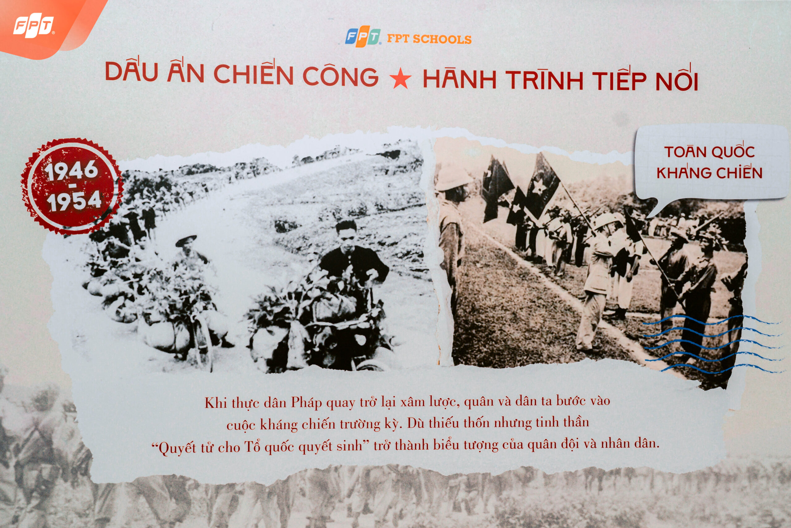 Dòng chảy lịch sử tiếp tục cuộn trào qua các trạm hình ảnh của hai cuộc kháng chiến vĩ đại. Triển lãm đã tái hiện sinh động không khí của chiến trường qua các tư liệu về Chiến thắng Điện Biên Phủ (1954). Chiến dịch này là một chiến thắng của ý chí và sức mạnh nhân dân, làm nên kỳ tích “lừng lẫy năm châu, chấn động địa cầu”. Đây là một dấu ấn chiến công không thể nào quên.